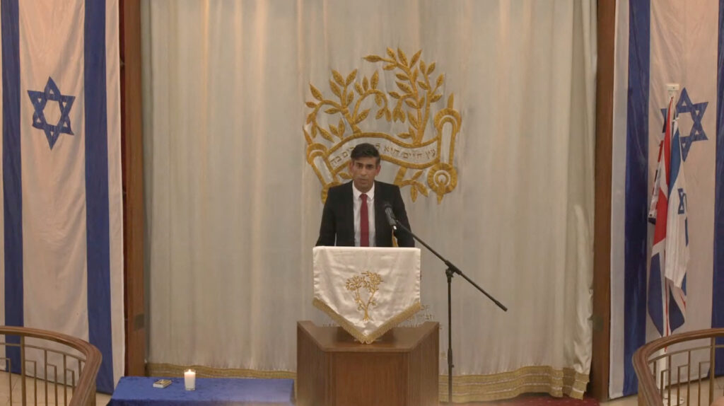 Britain’s Prime Minister Rishi Sunak speaks at Finchley United Synagogue, in London, Britain